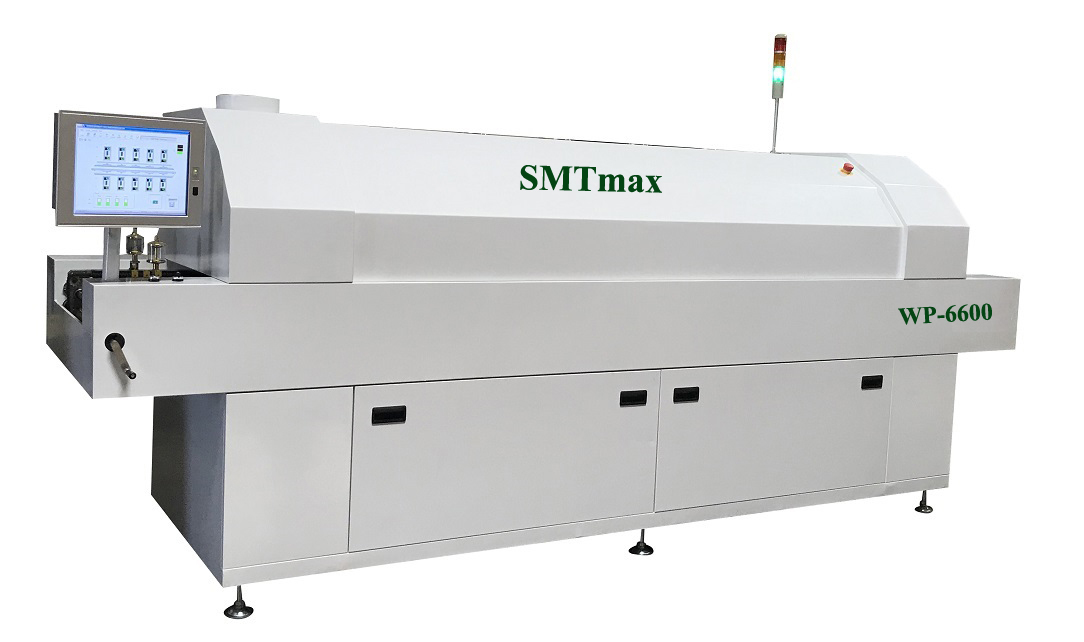 SMTmax WP-6600 systems provide optimized lead-free processing for the ultimate in productivity and efficiency. WP-6600 reflow oven exclusive closed loop convection control provides precise heating and cooling, programmable heat transfer, adding up to the lowest Cost of Ownership in the industry. WP-6600 reflow oven is top 6, bottom 6 heating zones and 1 top and 1 bottom cooling zones, 400oC maximum temperature and equipped with fully convection and double conveyors (mesh and rail both).